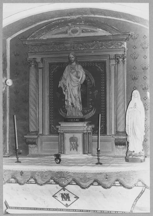 Autel et retable latéral en bois sculpté, doré et peint. Autel de forme tombeau galbé, peint en faux marbre, avec losange à côtés égaux portant le monogramme de la Vierge ; le retable comporte un registre couronné par un fronton cintré et une travée bordée par deux colonnes à fût cannelé à torsades.