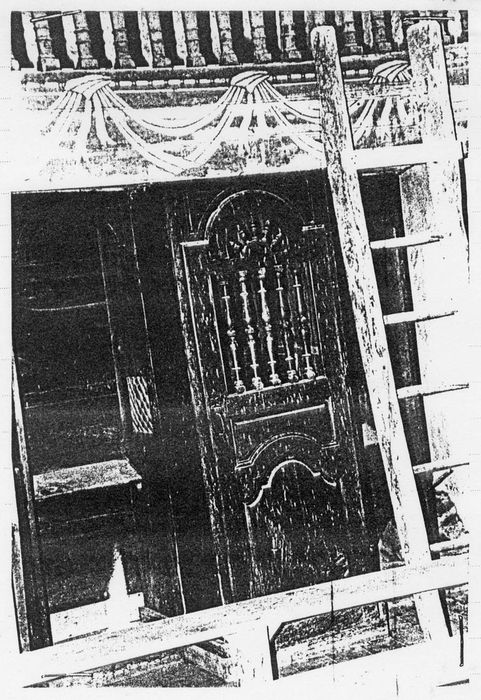 Confessionnal adossé, à plafond, à deux loges latérales ouvertes. Le panneau supérieur de la porte est à barreaux tournés.