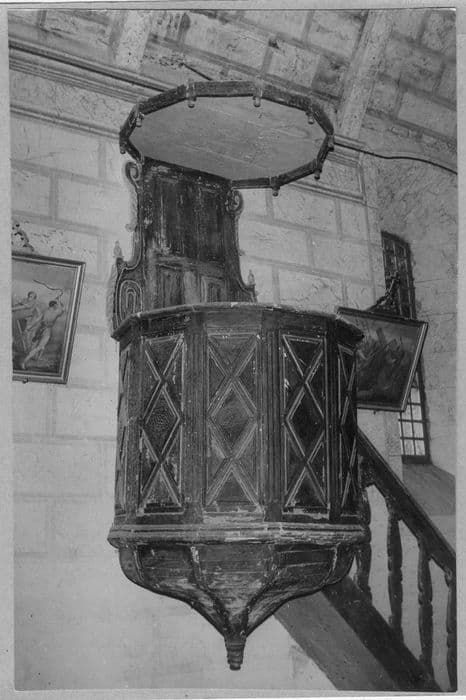Chaire à prêcher intérieure, fixe, adossée, suspendue cuve sur culot à neuf pans ; panneau d'applique dorsal, abat-voix.