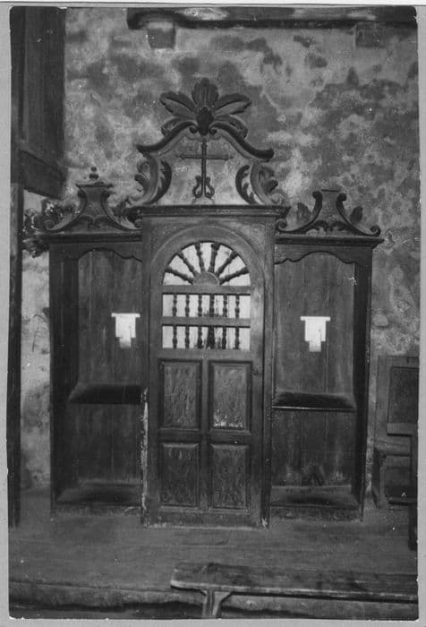 Confessionnal en bois à trois loges (loges latérales ouvertes) ; porte à panneaux moulurés (registre inférieur) et balustres (registre supérieur), cintrée ; la porte est surmontée d'un cartouche sculpté en forme de chapeau de gendarme.