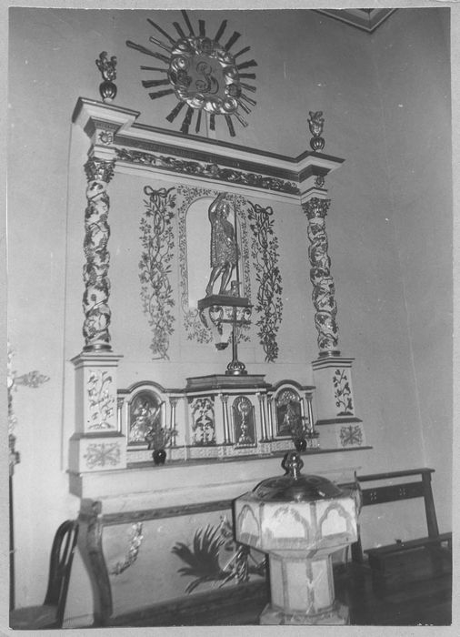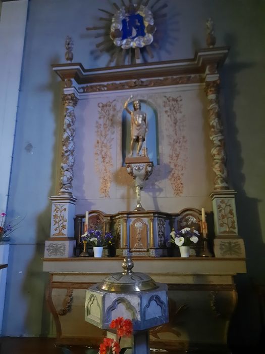 Autel et retable latéral nord avec la nuée qui le surmonte, en bois sculpté, doré et peint. Deux colonnes encadrent un décor peint à même le mur et supportent l'entablement rectiligne à ressauts (à l'aplomb des colonnes) que surmonte un médaillon appliqué au mur et doré, formé de nuées entourant un monogramme (B et ?) et entouré de rayons lumineux.