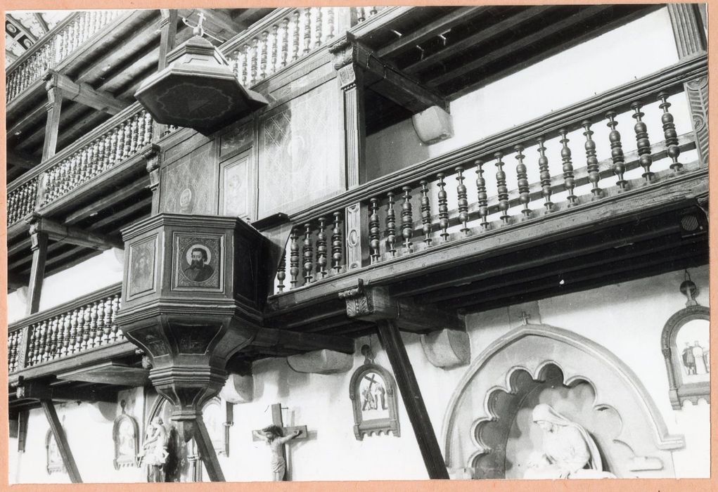 Chaire à prêcher adossée et suspendue avec cuve sur culot, panneau d'applique dorsal et abat-voix, en bois sculpté, doré et peint. Les panneaux de la cuve sont peints (celui du milieu représentant le Christ avec une auréole à croix grecque), ainsi que le panneau ornant le dorsal.