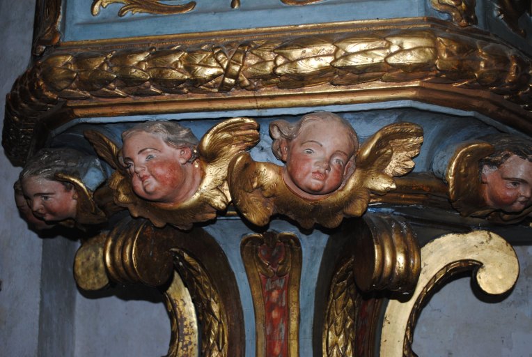 L'abat-voix, surmonté d'un angelot sonnant la trompette, est soutenu par deux angelots cariathides. Le dossier est formé d'une dalle de marbre dans une boiserie. Chaque pan de la cuve est formé d'une dalle de marbre dans une boiserie. La cuve est séparée de l'escalier par un petit palier à balustrade.