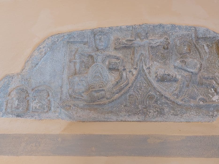 La Crucifixion, Sainte Barbe, la Vierge de Pitié, bas-relief. Pierre de Lourdes.