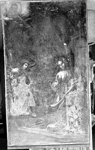 bois : taillé, peint, doré ; toile (support)