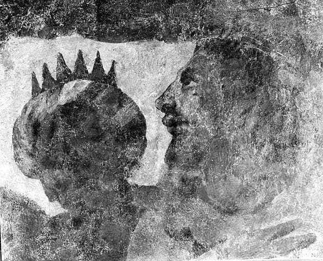 Fragments de peintures murales provenant de la nef, déposés et transposés, six panneaux dont deux représentant la Vierge et deux des personnages de l'ancienne Loi.