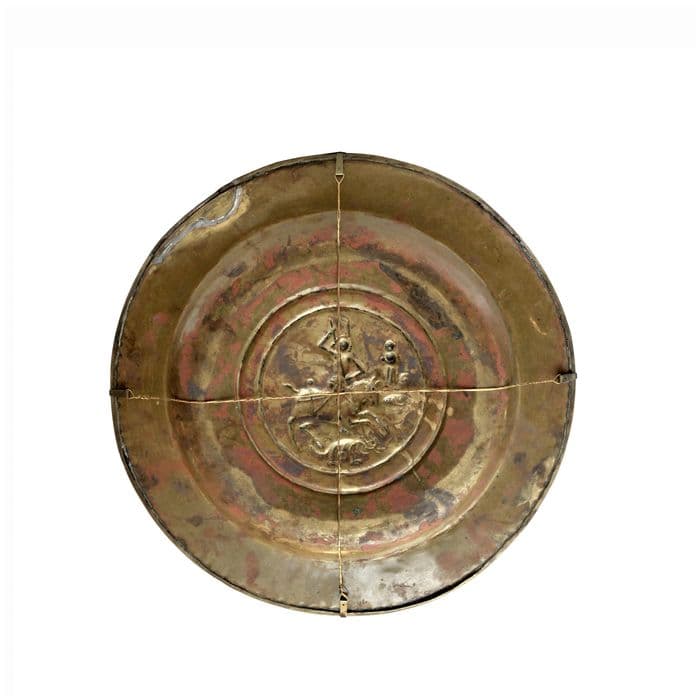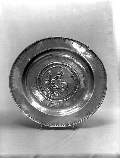 POP | Plateforme ouverte du patrimoine4 plats de quête : l'un avec une représentation de Saint Georges et le dragon (n°1) et trois autres plats de quête (n°2, n°3, n°4)