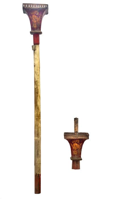 Porte-cierge de procession de forme carrée en tôle peinte en rouge vif avec motifs or, à bord supérieur doré et ajouré. La hampe est en bois tourné peint.