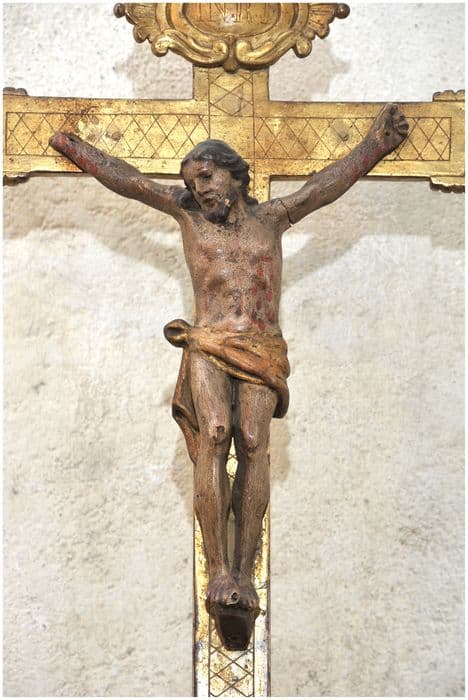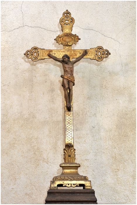 Croix dorée à la feuille ; pied rectangulaire ; fleurons ajourés aux extrémités de la croix. Christ peint.