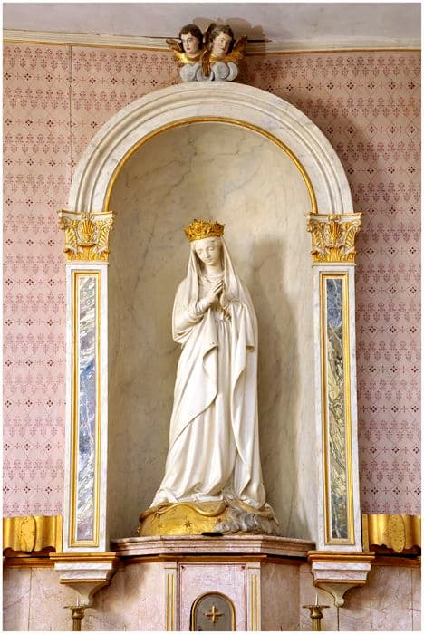 La Vierge est peinte en blanc, le globe et la couronne sont dorés, les nuées et le croissant de lune sont argentés.