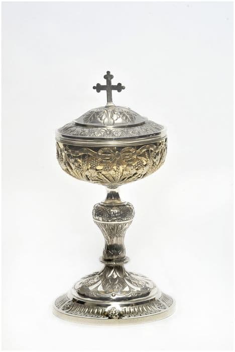 Blé raisin et roseau sont répartis sur l'ensemble du ciboire et se mélangent à un ruban sur la fausse coupe ajourée. Une croix surmonte le couvercle du ciboire.