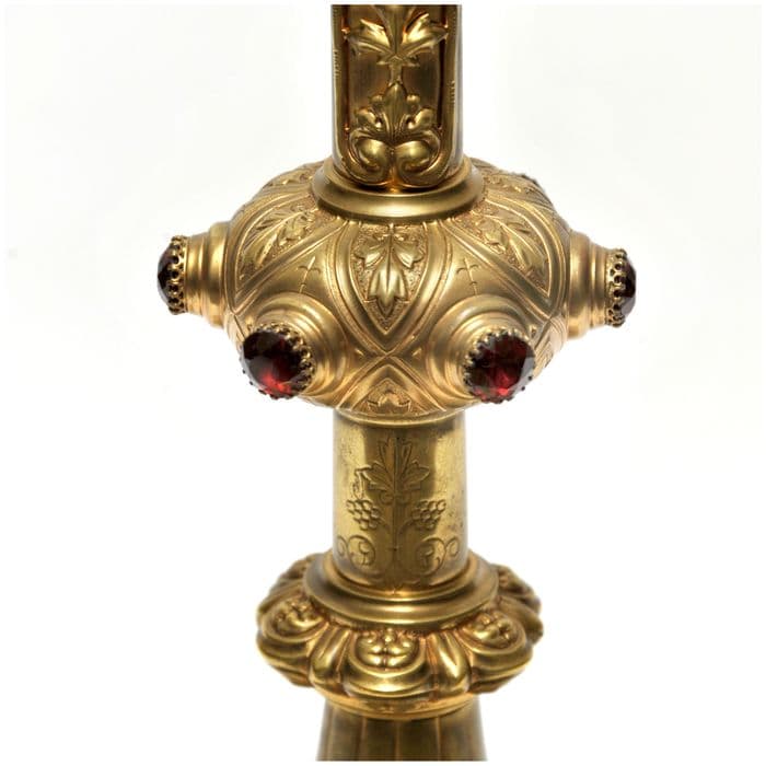 Ostensoir à pied polylobé à décor de médaillons quadrilobés en porcelaine peinte, de cabochons de verre rouge et de cabochons d'émail turquoise. Noeud aplati à boutons.