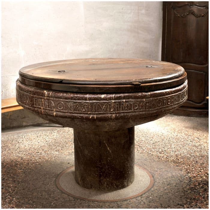 Fonds baptismaux en marbre rouge, de forme circulaire ornée de deux moulures. Ils sont surmontés d'un couvercle en noyer ouvrant par moitié.