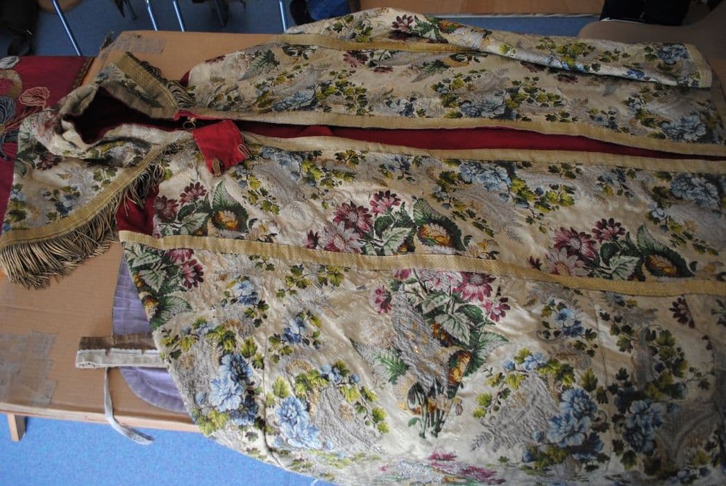 Chape en brocard blanc à décor floral rebrodé de fils d'or et d'argent.