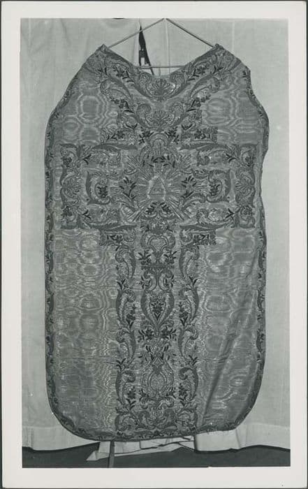 Chasuble en satin moiré brodé d'argent et de soie de couleur.