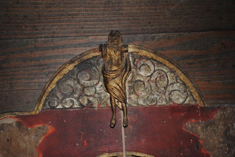 Porte-missel en bois peint avec au sommet un Christ en croix en bois doré et à la base, sous la tablette, une naissance de l'Enfant Jésus en ronde bosse, également dorée. Insignes de la Passion et de l'Epiphanie.