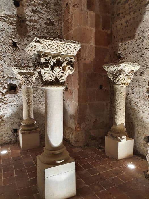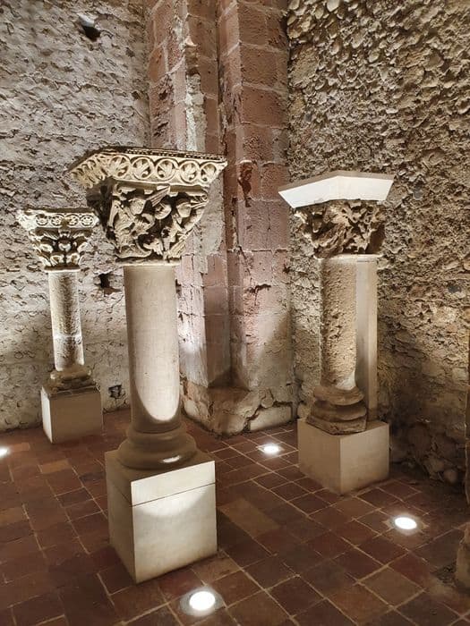 sept chapiteaux, sept tailloirs, sept fragments de colonnes, cinq bases et un bénitier