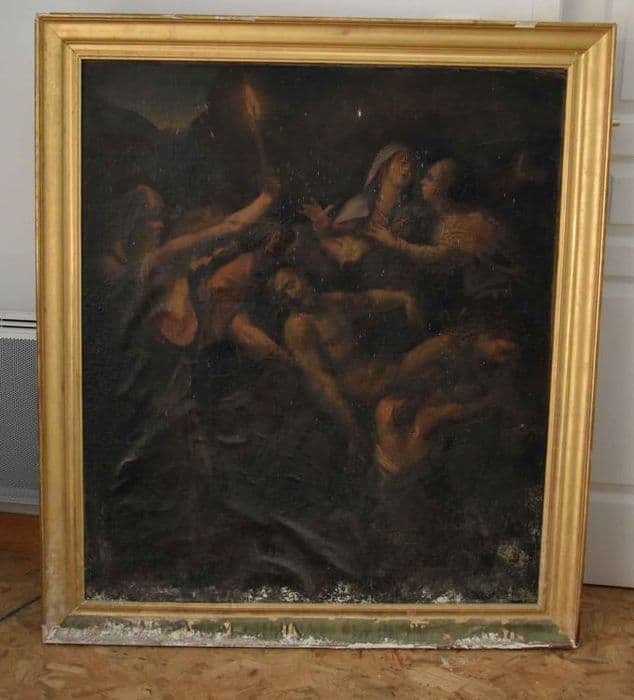 La composition, assez resserrée, regroupe autour du Christ, sur un fond de paysage peu lisible, plusieurs personnages : Vierge défaillante soutenue par une sainte femme, personnages âgés et barbus, Joseph d'Arimathie, Nicodème, personnages plus jeunes (saint Jean entre autres ?), dont l'un brandit une torche, seule source lumière de la composition, Marie-Madeleine, agenouillée de dos au premier plan devant le tombeau... L'assombrissement général de la toile rend difficile l'appréciation de ses qualités chromatiques.