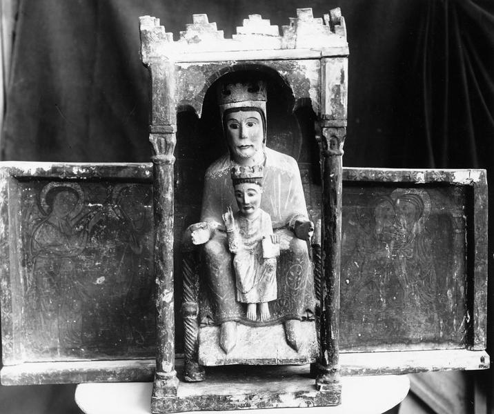 Retable de la Vierge, bois polychrome et panneaux peints à la détrempe, 12e siècle, avec Vierge assise, statue de bois polychrome, 12e siècle.