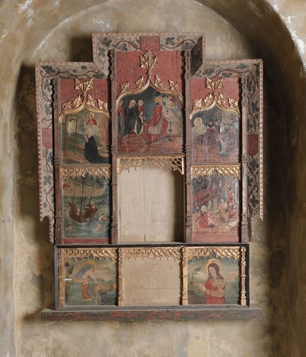 Antependium : peinture à la détrempe sur toile marouflée et enduite de plâtre (?). retable et antependium en bois sculpté et peint. statue en bois peint et doré. Le retable est divisé verticalement par deux contreforts surmontés de pinacles en trois registres. Trois panneaux peints décorent chacun des volets latéraux. Le compartiment central, plus haut que ces derniers et dont la moitié inférieure est occupée par la niche abritant la statue du saint, ne comporte qu'un panneau peint, au sommet.