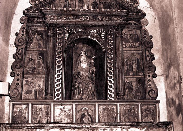 Retable en bois sculpté et peint. statue en bois peint et doré. statue dans la niche centrale.