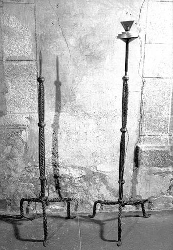 Chandelier à trois pieds, tige avec un noeud au milieu de la hauteur. Tige centrale en torsade accompagnée de quatre tiges plus petites en torsade également. La coupe horizontale de la tige est cruciforme. Il existe deux chandeliers, dont un seul est classé.