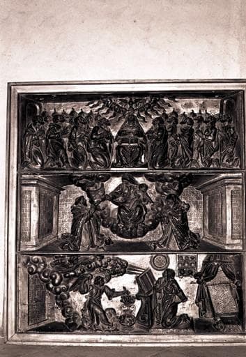 POP | Plateforme ouverte du patrimoinebas-relief du retable du Rosaire : Pentecôte, la Vierge du rosaire avec saint Dominique et sainte Catherine, l'Annonciation