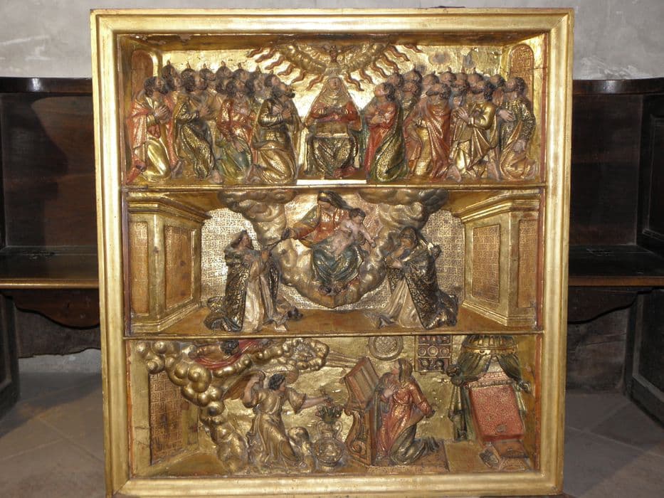 bas-relief du retable du Rosaire : Pentecôte, la Vierge du rosaire avec saint Dominique et sainte Catherine, l'Annonciation