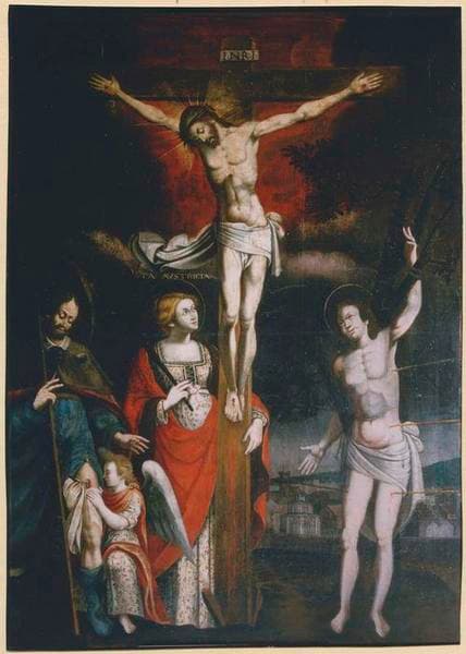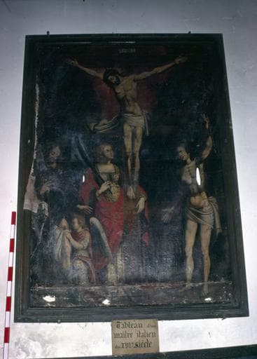 tableau : Christ en croix, entouré de saint Sébastien et de saint Roch, Santa Austricia (?) tenant la palme du martyre, enlace la croix (le)