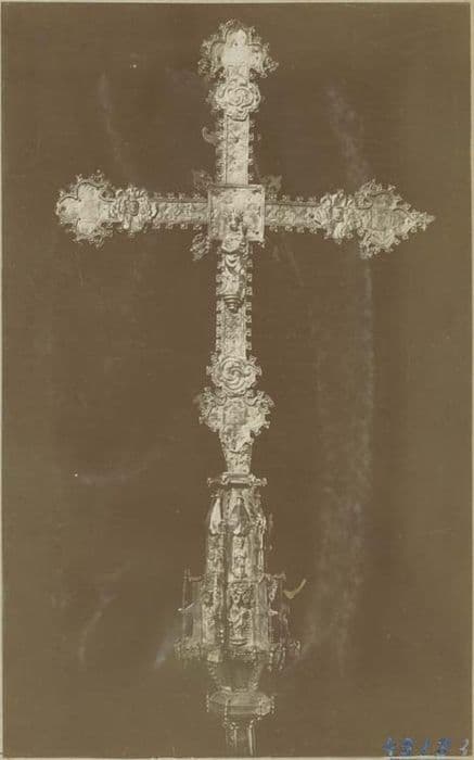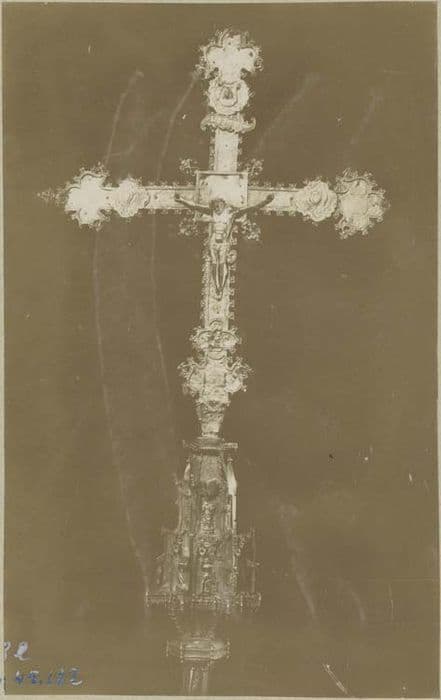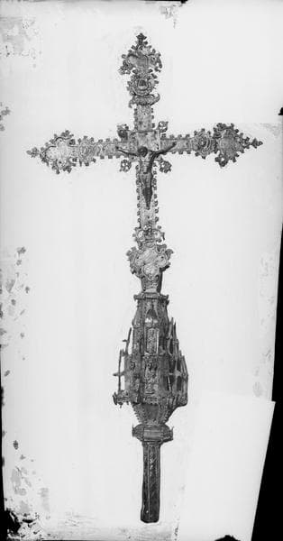 Croix de procession exceptionnelle par la richesse de son ornementation très raffinée et par ses dimensions. II s'agit d'une croix latine florencée bordée de crochets de style gothique, dont le plat des branches est orné de motifs d'entrelacs de style renaissance, gravés et ciselés, sur un fond à grènetis. Elle comporte sur la face une figurine du Christ et au revers une Vierge. A l'intersection des branches de la croix une plaque carrée porte le monogramme « IHS » au dessus d'un Christ mort en croix, aux bras horizontaux et le pied droit cloué sur le pied gauche. Au revers, une plaque identique porte un monogramme formé d'un V et d'un M entrelacés, au dessus de la statue de la Vierge couronnée portant l'enfant. Chacune des extrémités des branches de la croix porte une gravure représentant une tête d'ange, surplombée d'un médaillon rapporté, de style rocaille, en argent fondu, qui remplace probablement les quatre Evangélistes aujourd'hui manquants, ainsi que de possibles décors émaillés au revers. Le titulus, en forme de phylactère, semble tardif et a vraisemblablement remplacé un titulus rectangulaire, plus adéquation avec le style de cette croix. La croix repose sur une lanterne à deux étages, en forme de tour gothique, avec pinacles et contreforts dans une galerie ajourée. A l'étage inférieur, entre les contreforts, des statuettes occupent des niches surmontées d'un baldaquin ajouré. On peut identifier : saint Michel, saint Sébastien, sainte Anne et la Vierge, saint Paul, saint Pierre et la Vierge à l'Enfant. A l'étage supérieur, des personnages représentent des saints et des saintes de l'ordre des Dominicains, dans une structure lisse et triangulaire. La date de 1592, figure au bas de la croix, de part et d'autre d'une façade qui représente le couvent des Dominicains de Collioure. Des éléments ont été rajoutés aux 17e et 18e siècles suite à la perte de certains détails d'origine.