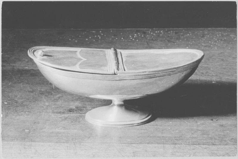 Navette en forme de berceau, sur pied à base circulaire, bordures de filets autour de la base, des bords de la coupe et du couvercle. Le couvercle s'ouvre sur une charnière à fléchisse et porte à l'extrêmité de sa partie mobile un bouton de préhension tronconique.
