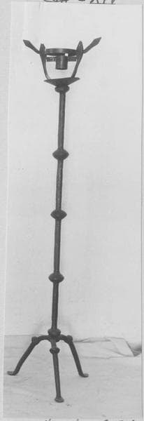 Chandelier constitué par une tige droite à cinq noeuds plantée sur trois pieds annelés.