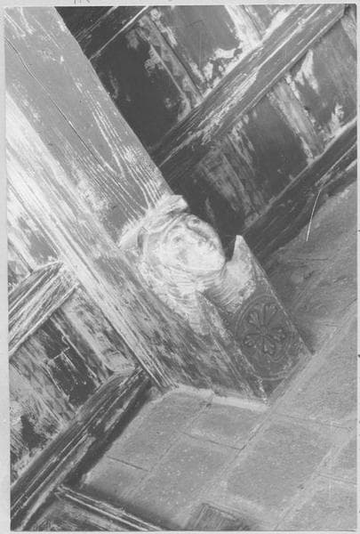 Le plancher est soutenu par treize solives, aux extrémités façonnées comme une sorte de proue, suivant un épannelage traditionnel, très fréquent en Roussillon. Les solives reposent elles-mêmes sur une poutre maîtresse, encastrée dans les piliers occidentaux de la nef et renforcée par deux corbeaux, sculptés l'un d'une tête d'homme, l'autre d'une tête de femme, où l'on voit des traces de peinture (volutes et fleurons). La tradition locale veut qu'elles représentent les 'donateurs', grâce à qui l'oeuvre aurait été exécutée. L'ensemble était peint et l'on discerne encore très bien le décor de dents de loup des couvrejoints lamellaires, caractéristiques des plafonds roussillonnais des 14e et 15e siècles. La balustrade a-t-elle été refaite postérieurement ? C'est possible, mais les balustres n'en présentent pas moins un profil archaïque. Au-dessus de celle-ci, une poutrelle, soutenue par deux poteaux latéraux, porte trois pièces de bois verticales, moulurées comme des modillons. Elles sont percées latéralement et paraissent avoir supporté deux carillons ou roues à clochettes, par l'intermédiaire d'une longue tige ou manivelle de fer forgé, retrouvée derrière le retable.