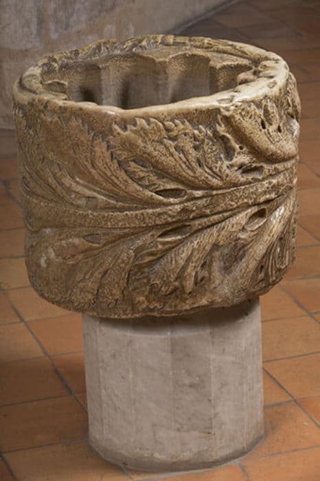 Cuve ornée de feuilles d'acanthe utilisée comme bénitier.