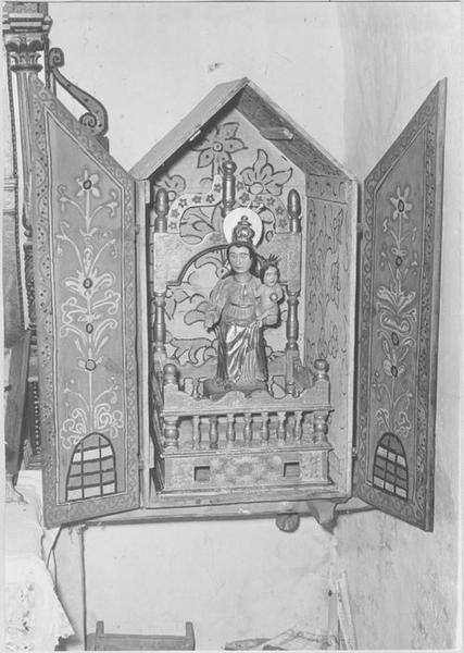 Vierge à l'Enfant, statue, bois doré et peint, dans sa chaire de procession et son armoire, bois peint, début du 17e siècle (Vierge et chaire) et 18e siècle (armoire). Vierge de type populaire, repeinte, mais dont la dorure est intacte et les vêtements d'une ornementation excellente (décor de fleurs, ramages et hachures, obtenu par regrattage de la feuille d'or, faisant apparaître la peinture sous-jacente). Type intéressant de la chaire processionnelle (cadireta) , inspirée des fauteuils locaux à balustres du début du 17e siècle (dorures et peintures anciennes). Cet ensemble est complété par une armoire à décor intérieur peint, d'allure 17e siècle, travail d'art populaire qui, d'après certains échantillons locaux datés, ne doit pas être antérieure au 18e siècle.