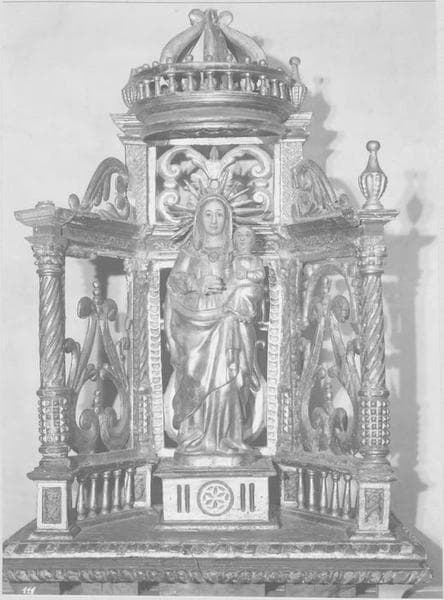 Vierge à l'Enfant, statue de procession et son dais. La cathèdre est ornée de colonnes cannelées et est surmontée d'un dais ajouré. Les trois panneaux sont également ajourés et ornés d'un décor de feuilles. La Vierge tient l'enfant sur son bras droit. Elle est enveloppée dans un voile qui tombe sur les épaules et dont un pan est retenu à la ceinture.