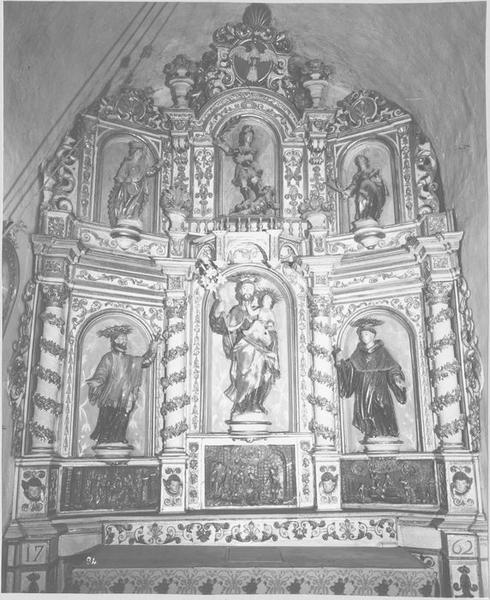 Disposition actuelle, de haut en bas et de gauche à droite : l'Aigle au sommet ; saint Michel au-dessous ; sainte Catherine, saint Joseph (au centre du premier et du deuxième niveau) et sainte Agathe au deuxième niveau ; saint François Xavier, à gauche et saint Benoit (?), à droite, au premier niveau ; le Mariage de la Vierge, la Nativité du Christ et la mort de Joseph sur la prédelle.