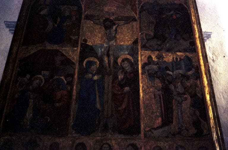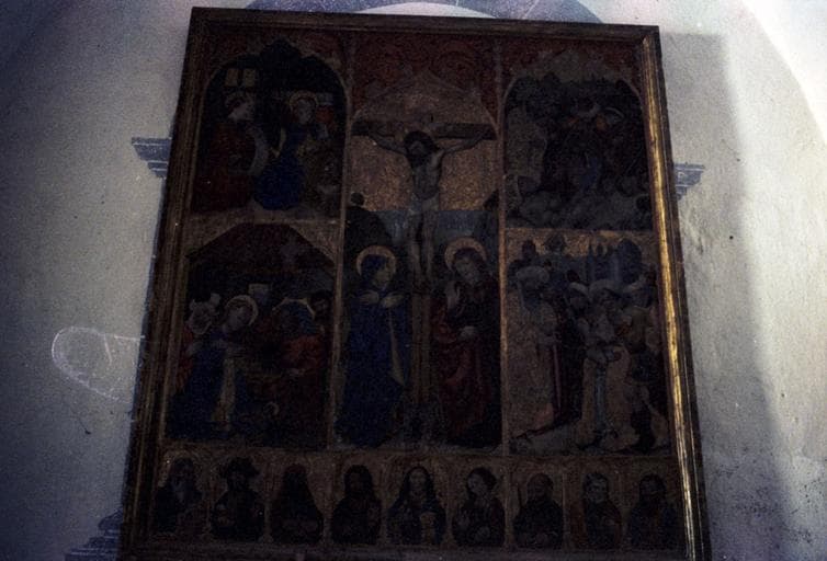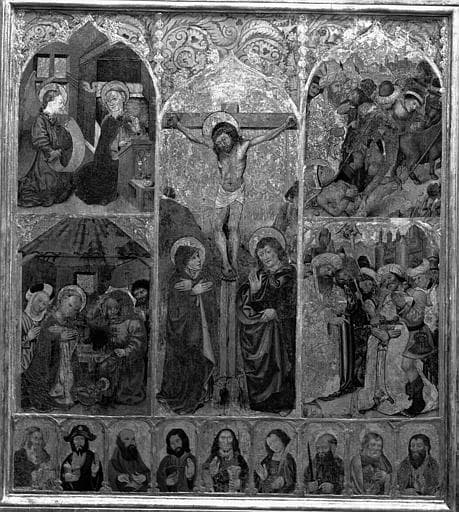 retable : la Crucifixion, l'Annonciation, l'adoration de l'Enfant Jésus, scènes du martyre de saint Sernin