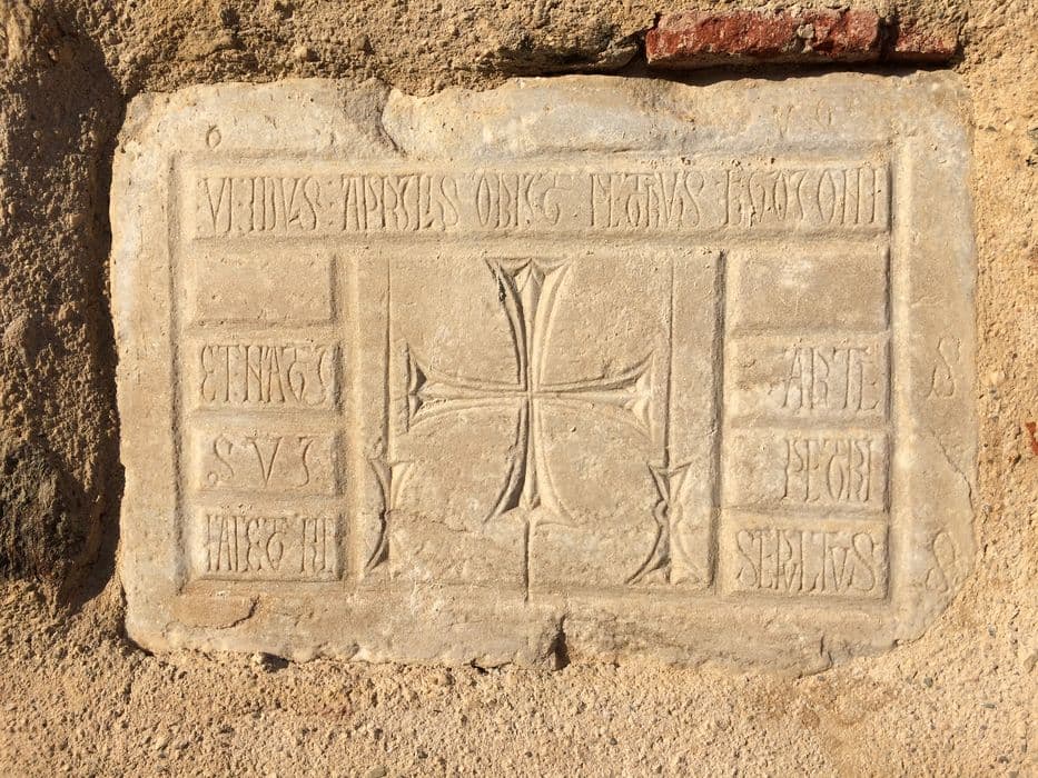 Inscription funéraire. Inscription gravée entre une croix et deux chandeliers.