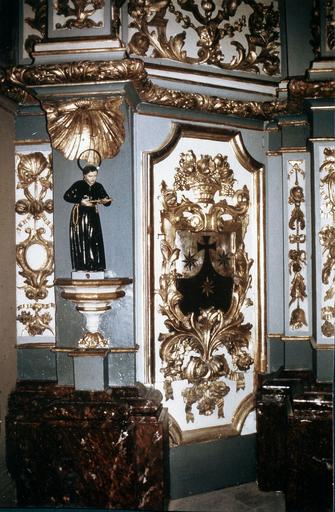 Armoiries : d'argent à une montagne du Carmel de sable, sommée d'une croix pattée aussi de sable, accostée de trois étoiles (d'or ?), posées 2 et 1, la troisième brochante, armoiries du Carmel (peint à la base et de part et d'autre du retable).