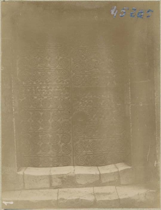 Pentures en fer forgé de la porte d'entrée constituées par une barre de fer assez mince, cannelée et fendue à son extrémité de façon que chacune des deux parties à son tour, se recourbe en volute ; d'autres volutes, pareilles aux premières, sont forgées ensuite et fixées.