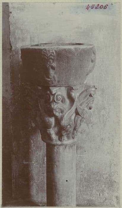 Cuve conique supportée par un chapiteau sur une colonnette tronquée.