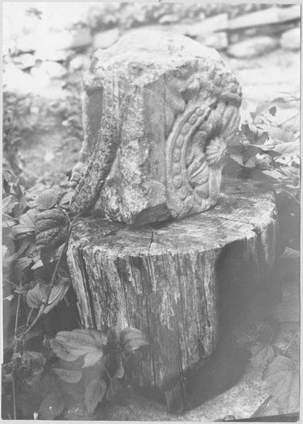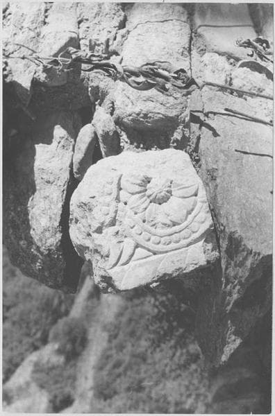 Fragment de claveau, sculpté d'animaux dans un rinceau fait d'un ruban perlé (tête) et de rosettes entrelacées d'un ruban perlé (intrados). marbre blanc et rose de Ria-Villefranche. Emploi du trépan.
