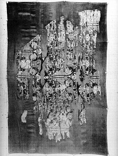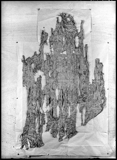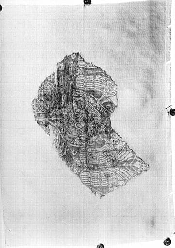 Fragments de tissu provenant d'une ancienne chasuble (qui servait à vêtir la Vierge). Le tissu est de couleur rouge, avec des dessins noirs et jaunes représentant l'aigle bicéphale aux oreilles pointues tenant dans ses serres un quadrupède.