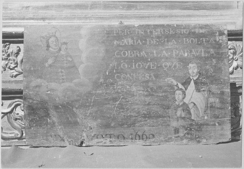 tableau ex-voto : la Vierge apparait dans un nuage face à un prêtre bénissant un jeune garçon