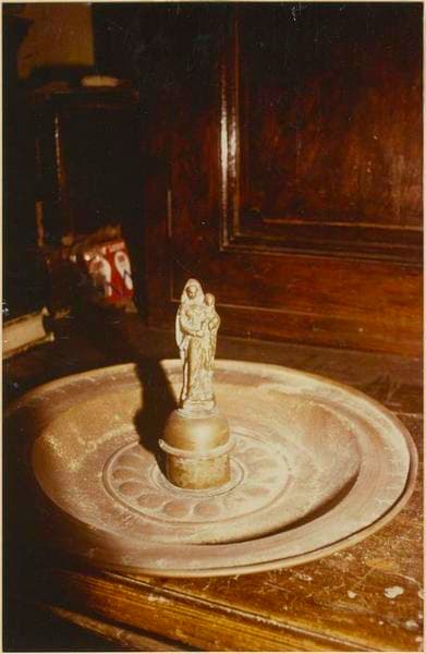 Porte au centre un support et une Vierge à l'Enfant amovible. Le fond du plat est godronné en relief. Le marli est gravé d'un motif d'arcades fleurdelysées.