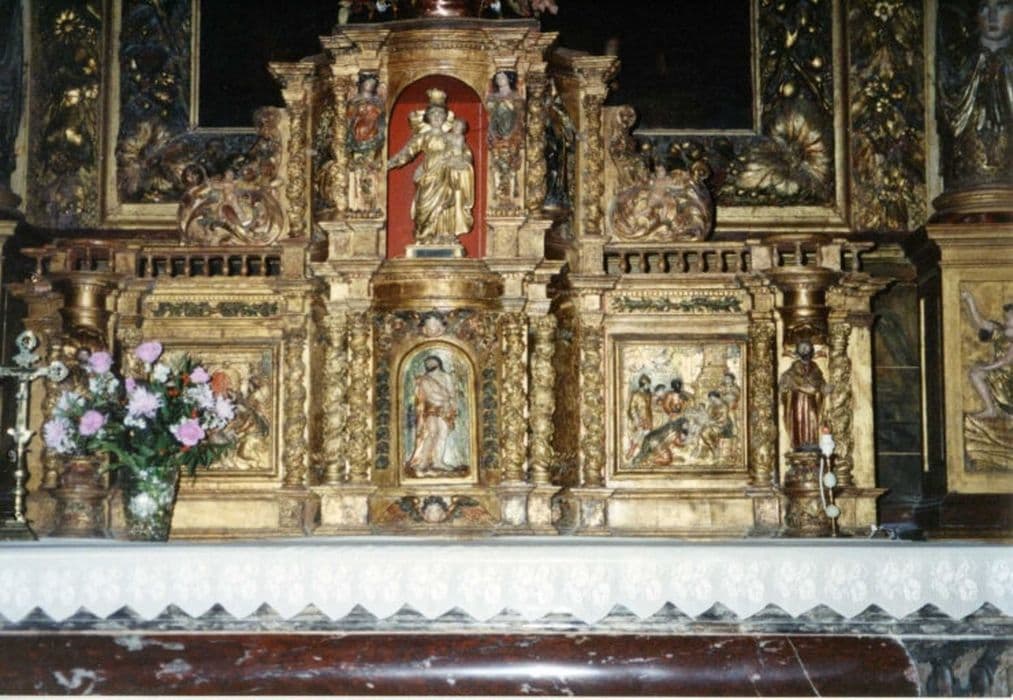 Colonnes salomoniques à enroulements de pampres, encadrant les trois panneaux sculptés du tabernacle proprement dit, les bas-reliefs latéraux et le baldaquin du sommet. Deux bas-reliefs, Adoration des Mages et Adoration des bergers, six statuettes de saints, Christ aux outrages en bas reliefsur la porte du tabernacle, anges et cariatides, constituent l'ornementation principale de cette belle et harmonieuse composition baroque.