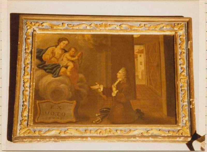 tableau ex-voto à la Vierge du Rosaire : un gentilhomme agenouillé recevant le rosaire de l'Enfant Jésus porté par sa Mère, cadre