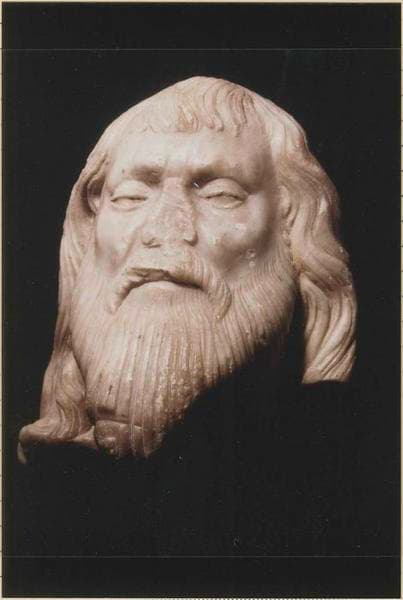 Tête d'homme aux yeux mi-clos, barbue, aux longs cheveux, appartenant à l'origine à une statue plus haute (troncature irrégulière au niveau du cou).