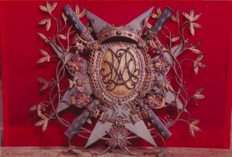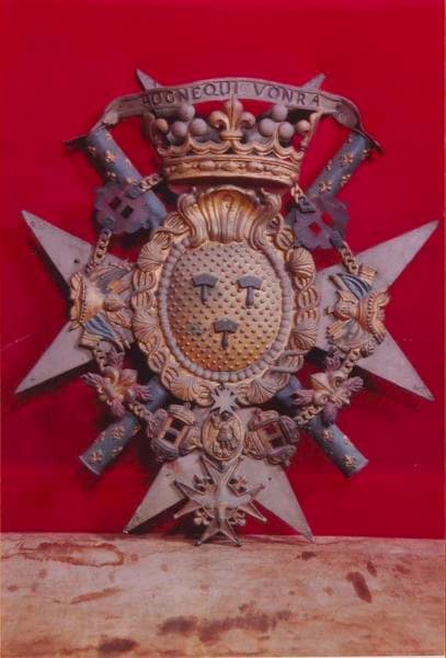 éléments d'une plaque commémorative : trois blasons au chiffre et aux armes du maréchal de Mailly, gouverneur du Roussillon, et de son épouse